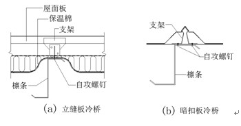 在不外露螺釘情況下,其冷橋通路是通過(guò)屋面板--支架--固定支架--自攻螺釘-檁條而形成的。