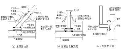 出屋面拉索或出屋面設(shè)備支架的防冷橋問(wèn)題的解決,在實(shí)際工程中是比較困難的。因?yàn)榧匆紤]防冷橋,同時(shí)還要防漏水。經(jīng)多年研究和實(shí)踐,用德泰蓋片的處理方法能夠長(zhǎng)效解決這些情況防冷橋問(wèn)題,具體方法(如圖10)。