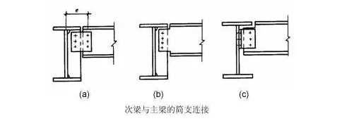 次梁與主梁的連接通常設(shè)計(jì)為鉸接,主梁作為次梁的支座,次梁可視作簡支梁。其拼接形式如下圖所示,次梁腹板與主梁的豎向加勁板用高強(qiáng)度螺栓連接(圖a、b),當(dāng)次梁內(nèi)力和截面較小時(shí),也可直接與主梁腹板連接(圖c)。