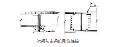 當(dāng)次梁跨數(shù)較多,跨度、荷載較大時(shí),次梁與主梁的連接宜設(shè)計(jì)為剛接,此時(shí)次梁可視作連續(xù)梁,這樣可以減少次梁的撓度,節(jié)約鋼材。次梁與主梁的剛接形式如下圖所示。