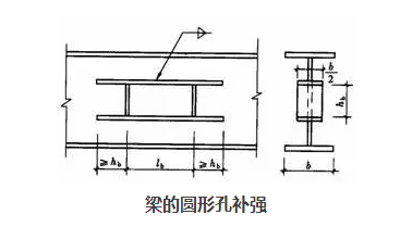 當(dāng)因管道穿過需要在梁腹板上開孔時(shí),應(yīng)根據(jù)孔的位置和大小確定是否對梁進(jìn)行補(bǔ)強(qiáng)。當(dāng)圓孔直徑小于或等于1/3梁高,且孔洞間距大于3倍孔徑,并避免在梁端1/8跨度范圍內(nèi)開孔時(shí),可不予補(bǔ)強(qiáng)。