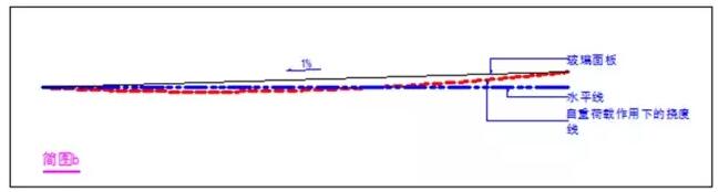 大家可以想到,風(fēng)荷載屬于可變荷載,在風(fēng)壓消失的時(shí)候,它對(duì)玻璃的荷載消失,所產(chǎn)生的變形相應(yīng)消失,而玻璃的自重屬于永久荷載,它對(duì)玻璃產(chǎn)生的變形卻不會(huì)消失,那么它的變形就會(huì)如圖所示的那樣,在玻璃中部會(huì)有凹陷,形成一個(gè)天然的水坑或者說(shuō)是垃圾坑,那么造成積水積灰就成必然了。