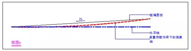 那么我們把坡度調(diào)整為2%呢,請(qǐng)大家看“簡(jiǎn)圖c”,此時(shí),水坑的底部基本與水平線相切,相對(duì)于水平面的凹陷現(xiàn)象基本消失,但是筆者卻也同時(shí)發(fā)現(xiàn),在實(shí)際中,按此方法設(shè)計(jì)的雨棚,還是會(huì)有少量的積水積灰現(xiàn)象的發(fā)生,這種現(xiàn)象筆者初步分析為施工上的少許誤差或支撐桿件所受永久荷載的變形所造成,那么我們就還有必要通過(guò)技術(shù)手段來(lái)解決此問(wèn)題。