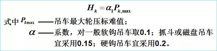 GB50017規(guī)定,重級(jí)工作制(工作級(jí)別為A6~A8)吊車梁,由于吊車擺動(dòng)引起的作用于每個(gè)輪壓處的水平力標(biāo)準(zhǔn)值為: