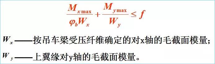連有制動(dòng)結(jié)構(gòu)的吊車梁,側(cè)向彎曲剛度很大,整體穩(wěn)定得到保證,不需驗(yàn)算。加強(qiáng)上翼緣的吊車梁,整體穩(wěn)定公式: