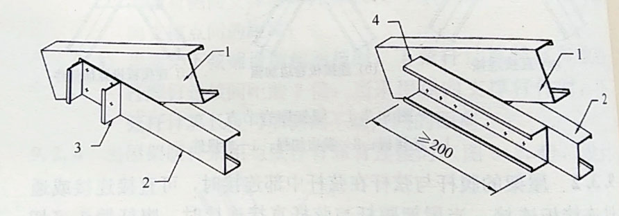 一、屋脊處無集中荷載時,屋架的腹桿與弦桿在屋脊處可直接連接(圖1a);屋脊處有集中荷載時應通過連接板連接(1bc)。當采用連接板連接時,連接板宜卷邊加強(圖1b)或設(shè)置加強件(1c)。弦桿與腹板或與節(jié)點板之間連接螺釘數(shù)量不宜少于4個。采用直接連接時,屋脊處必須設(shè)置縱向剛性支撐。